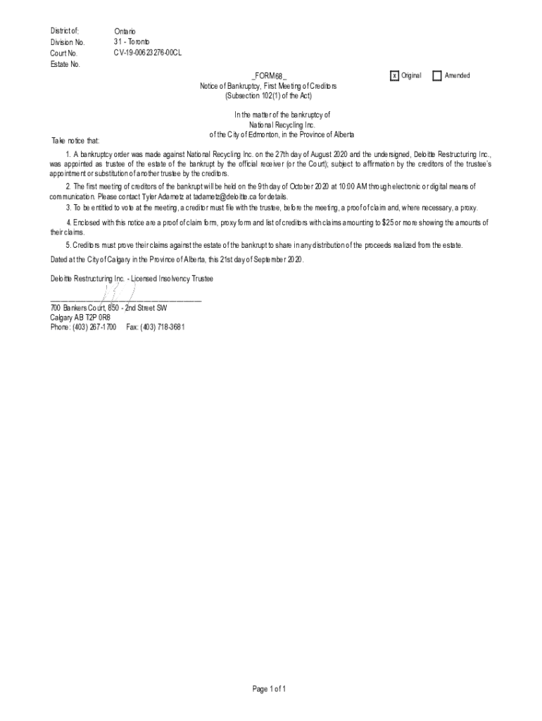 District of: Division No. Court No. Estate No.Ontario 31 Toronto CV190062327600CL _FORM 68_ Notice of Bankruptcy, First Meeting of Creditors (Subsection 102(1) of the Act)Take notice that:XOriginalAmendedIn