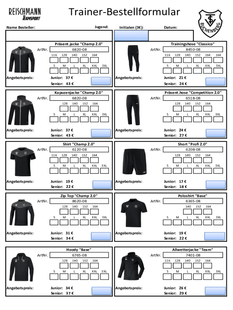 TrainerBestellformular Jugend:Name Besteller:ArtNr.Angebotspreis:Prsent.jacke \"Champ 2.0\" 682008 116128140152164SMLXLXXLAngebotspreis:140152164MLXLXXLAngebotspreis:140152164SMLXLXXL3XLSAngebotspreis:152164MLXLXXLLXLXXL3XL152164MLXLXXL3XLAngebotspreis:140152164MLXLXXL3XL128140152164MLXLXXL3XLPoloshirt