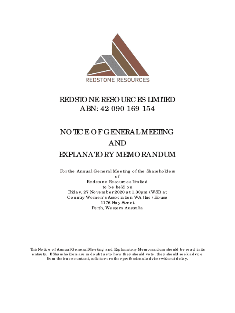This document serves as a notice for the Annual General Meeting of Redstone Resources Limited on 27 November 2020, detailing resolutions and voting information.