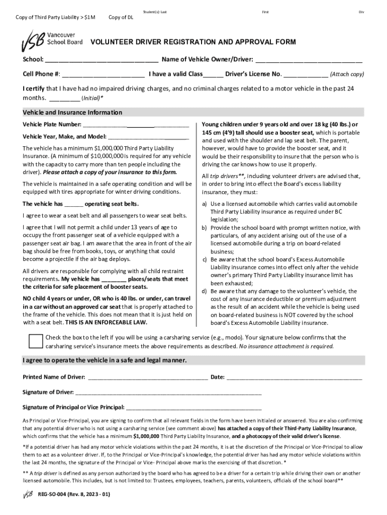 Copy of Third Party Liability $1M Copy of DLStudent(s): LastFirstDivVOLUNTEER DRIVER REGISTRATION AND APPROVAL FORM School: ___ Name of Vehicle Owner/Driver: ___ Cell Phone #: ___ I have a valid Class___