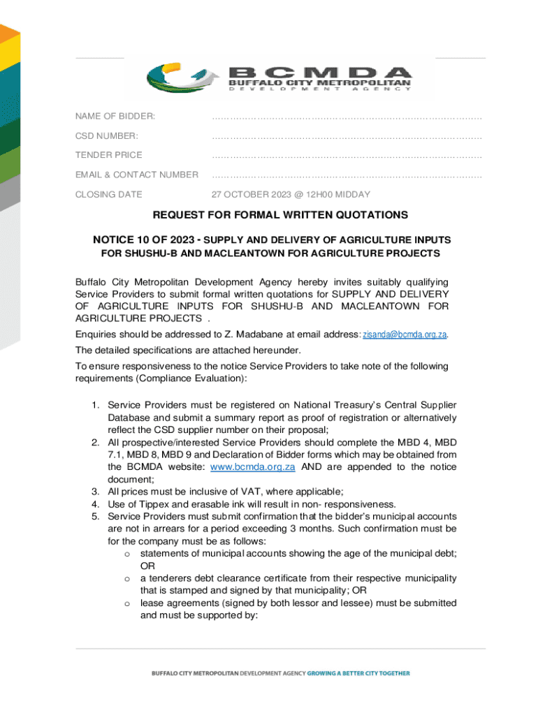 Get the free NOTICE 10 OF 2023 - SUPPLY AND DELIVERY OF AGRICULTURE INPUTS