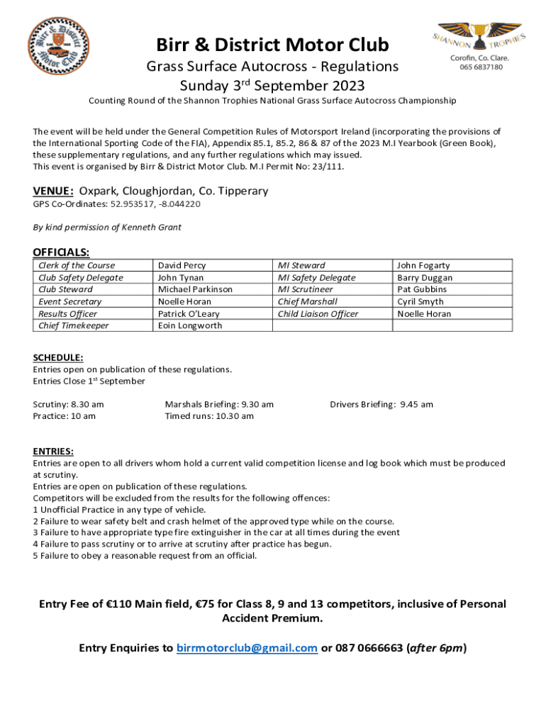 Bird & District Motor Club Grass Surface Autocross Regulations Sunday 3rd September 2023 Counting Round of the Shannon Trophies National Grass Surface Autocross Championship The event will be held