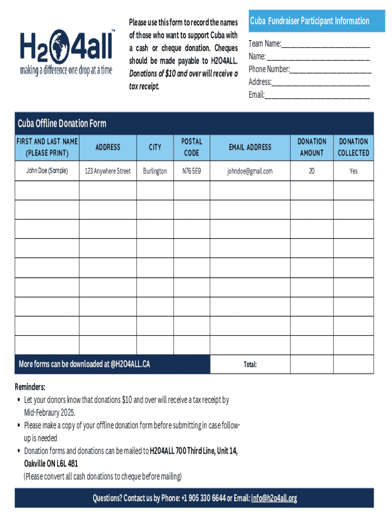 Join our Cuba fundraiser by completing the offline donation form for cash or check support. Donations over $10 receive a tax receipt. Act now!
