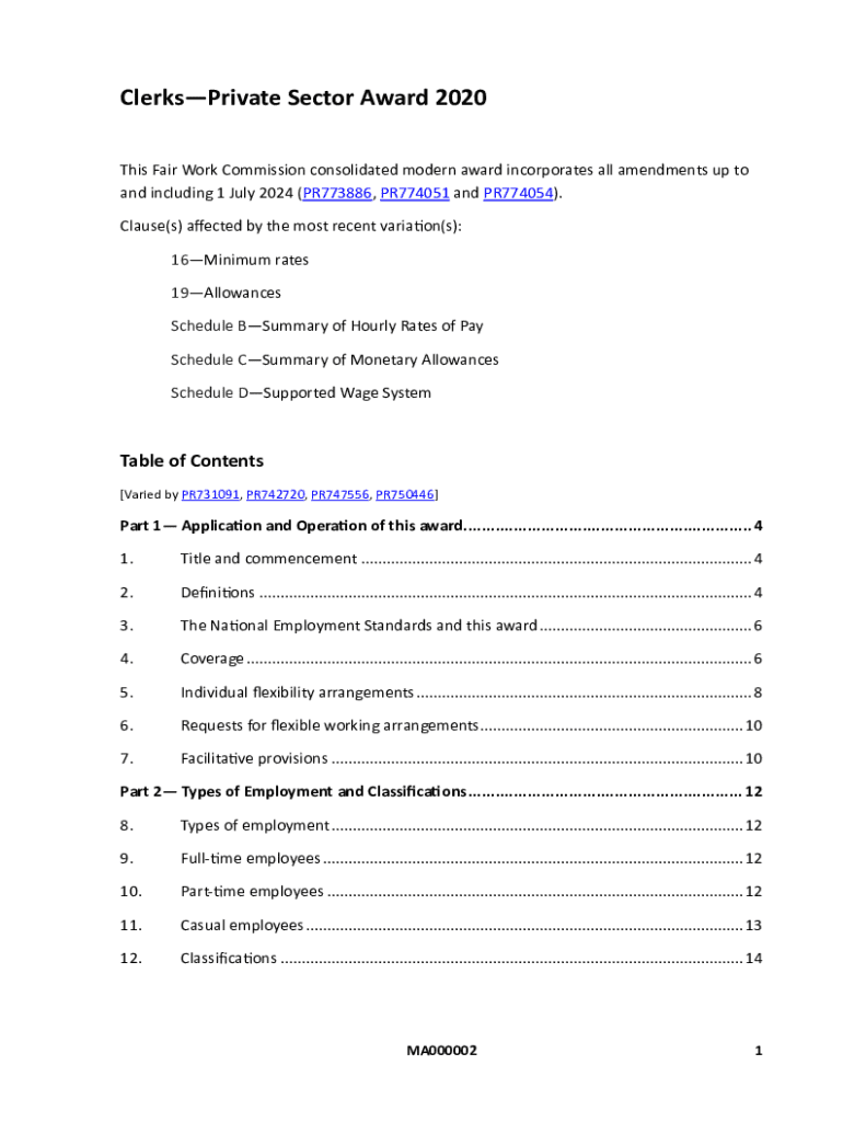 The Clerks Private Sector Award 2020 outlines employment conditions for clerical workers in Australia, covering rates, allowances, overtime, and leave entitlements.
