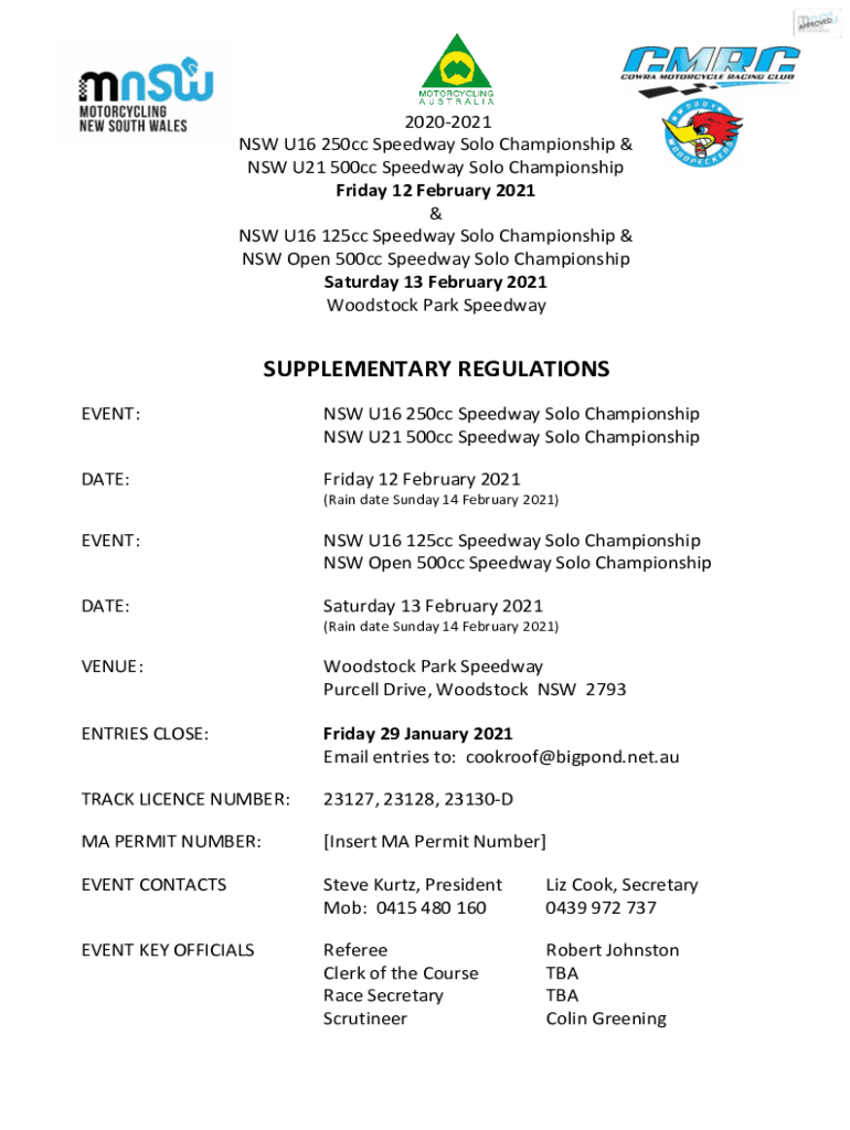Register for the 2020-21 NSW U16 and U21 Speedway Solo Championships at Woodstock Park on February 12-13, 2021. Secure your entry before January 29, 2021.