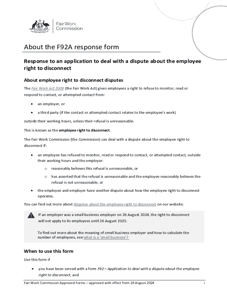 This document is a response form for disputes under the Fair Work Act 2009 regarding the employee right to disconnect outside work hours.