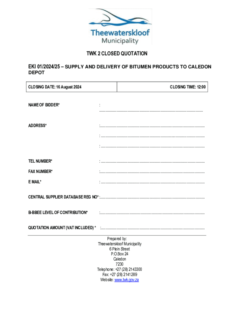 Request for formal written price quotations for the supply and delivery of bitumen products to Caledon Depot. Closing date is 16 August 2024.