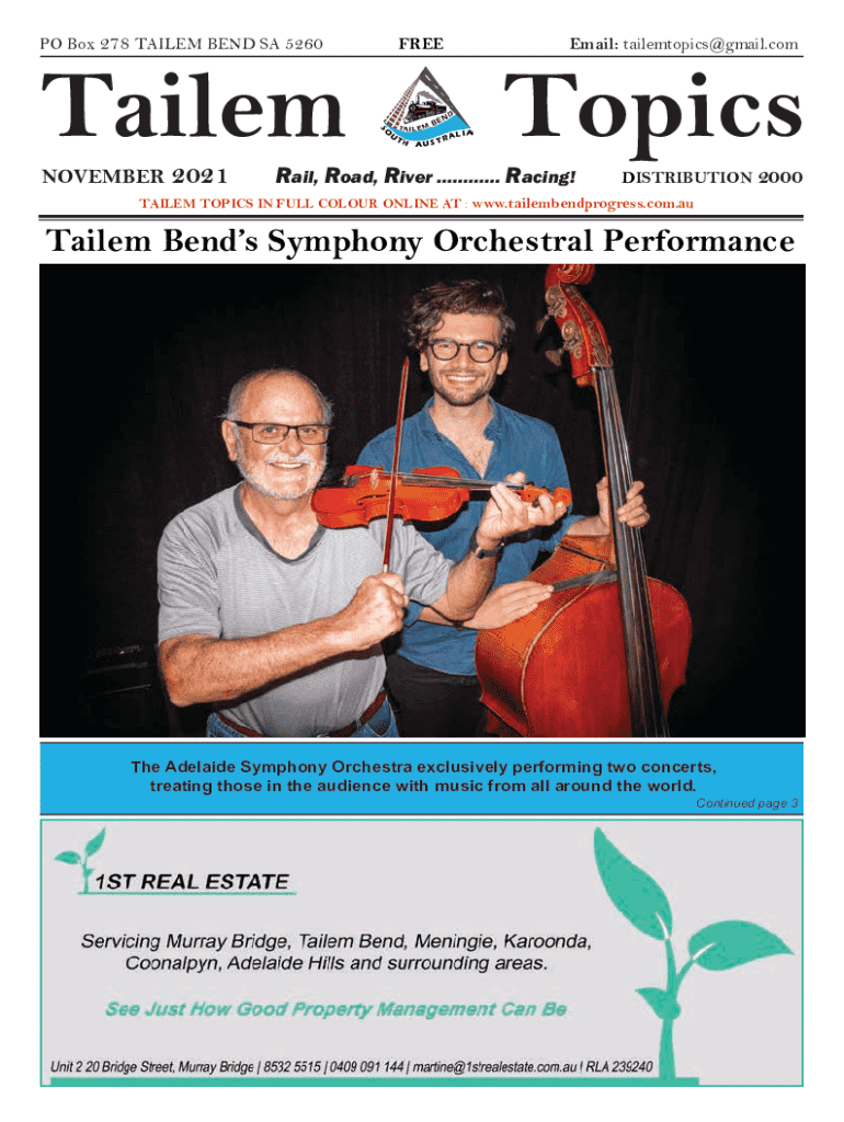 PO Box 278 TAILEM BEND SA 5260Tailem NOVEMBER 2021FREEEmail: tailemtopics@gmail.comTopicsRail, Road, River ............ Racing!DISTRIBUTION 2000TAILEM TOPICS IN FULL COLOUR ONLINE AT : www.tailembendprogress.com.auTailem