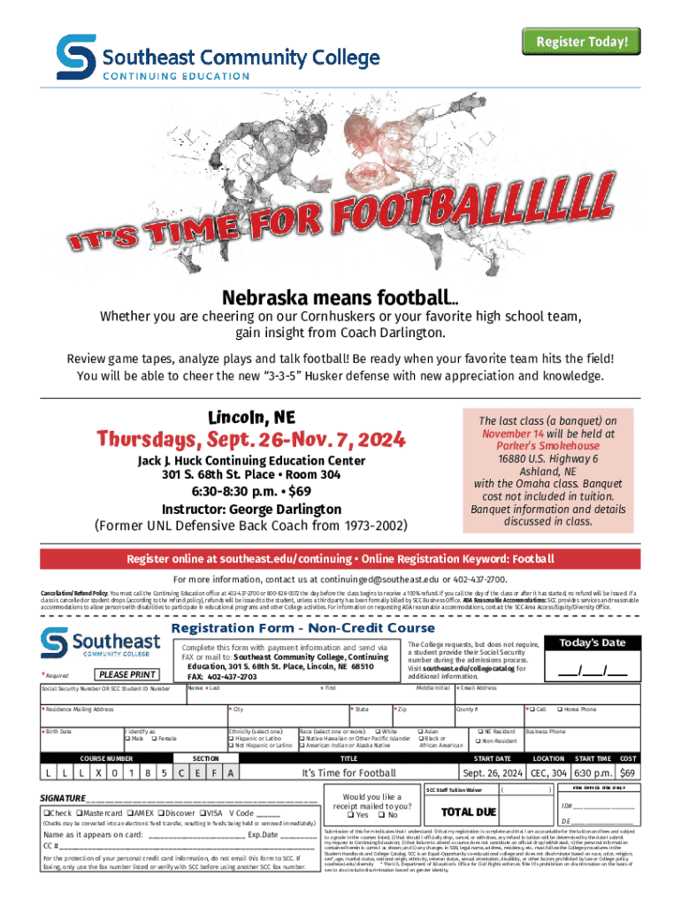 Register Today!Nebraska means football...Whether you are cheering on our Cornhuskers or your favorite high school team, gain insight from Coach Darlington. Review game tapes, analyze plays and talk