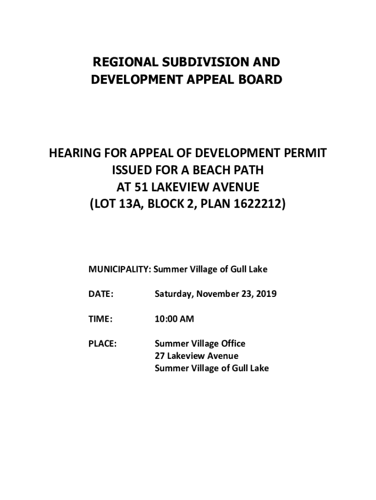 REGIONAL SUBDIVISION AND DEVELOPMENT APPEAL BORDERING FOR APPEAL OF DEVELOPMENT PERMIT ISSUED FOR A BEACH PATH AT 51 REVIEW AVENUE (LOT 13A, BLOCK 2, PLAN 1622212)MUNICIPALITY: Summer Village of Gull