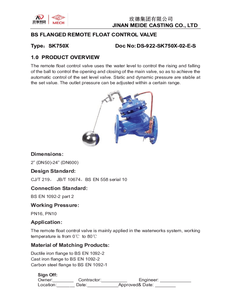 JINAN MEIDE CASTING CO., LTD BS FLANGED REMOTE FLOAT CONTROL VALVE TypeSK750XDoc No: DS922SK750X02ES1.0 PRODUCT OVERVIEW The remote float control valve uses the water level to control the rising and