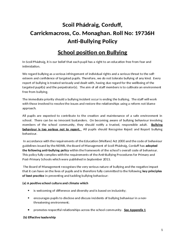 Template 19736H Anti-Bullying Policy School position on Bullying instructions