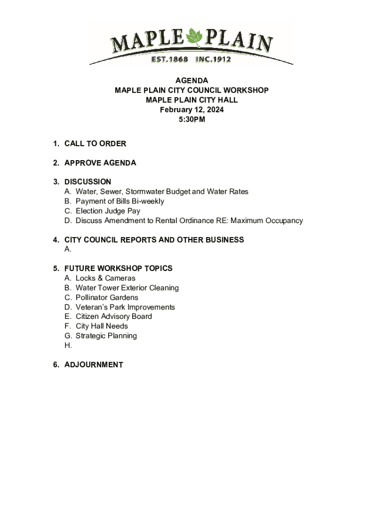 AGENDA MAPLE PLAIN CITY COUNCIL WORKSHOP MAPLE PLAIN CITY HALL February 12, 2024 5:30PM 1. CALL TO ORDER 2. APPROVE AGENDA 3. DISCUSSION A. Water, Sewer, Stormwater Budget and Water Rates B. Payment