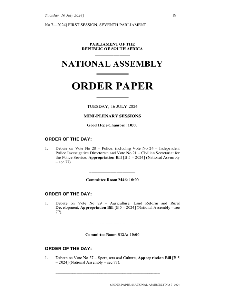 Tuesday, 16 July 2024]19No 72024] FIRST SESSION, SEVENTH PARLIAMENTPARLIAMENT OF THE REPUBLIC OF SOUTH AFRICA ___NATIONAL ASSEMBLY ORDER PAPER TUESDAY, 16 JULY 2024 MINIPLENARY SESSIONS Good Hope
