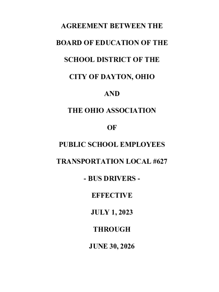 AGREEMENT BETWEEN THE BOARD OF EDUCATION OF THE SCHOOL DISTRICT OF THE CITY OF DAYTON, OHIO AND THE OHIO ASSOCIATION OF PUBLIC SCHOOL EMPLOYEES TRANSPORTATION LOCAL #627 BUS DRIVERS EFFECTIVE JULY