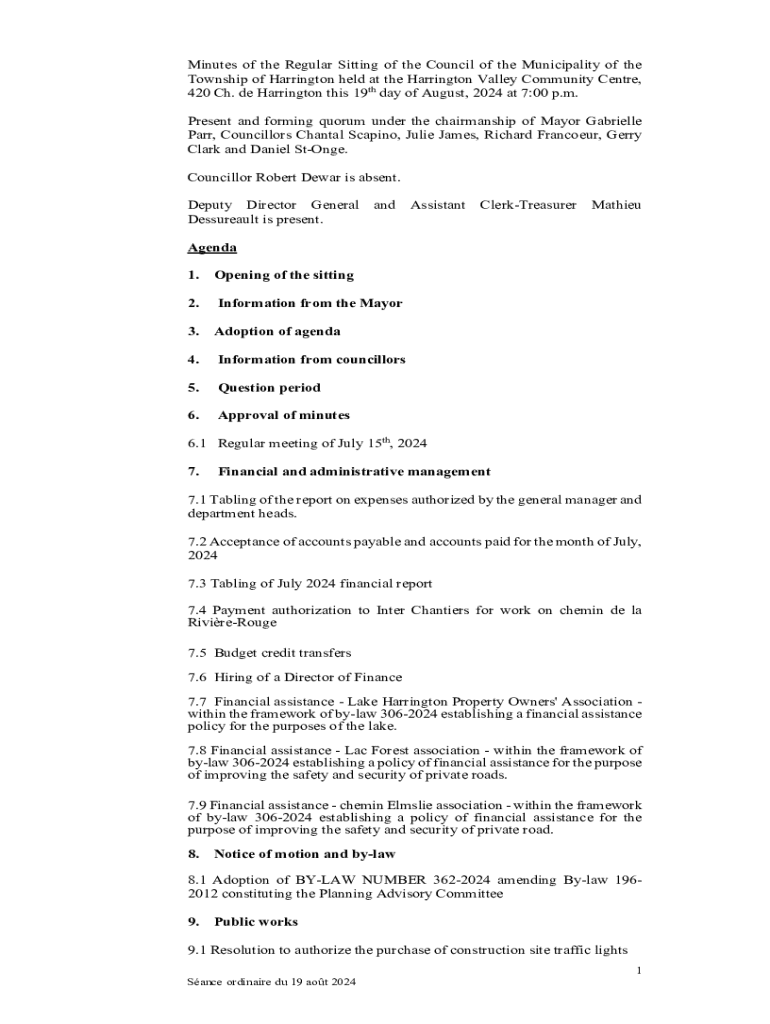 Minutes of the Regular Sitting of the Council of the Municipality of the Township of Harrington held at the Harrington Valley Community Centre, 420 Ch. de Harrington this 19th day of August, 2024