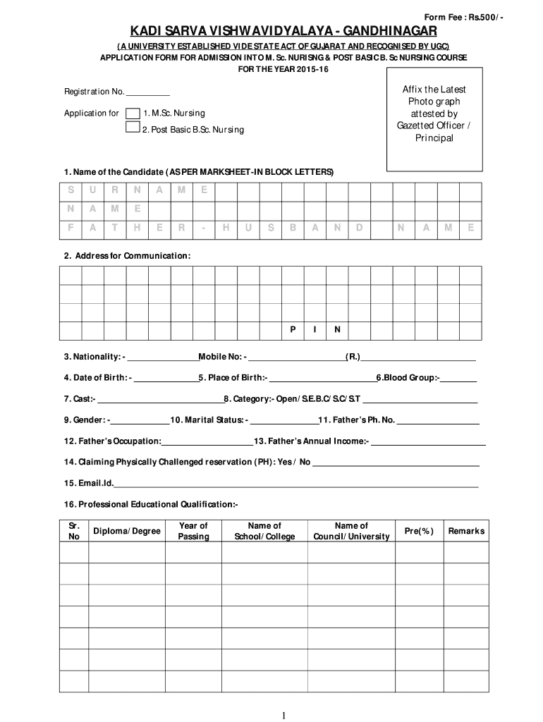Form Fee : Rs.500/- KALI SARA VISHWAVIDYALAYA — GANDHINAGAR (A UNIVERSITY ESTABLISHED VIDE STATE ACT OF GUJARAT AND Recognized BY UGC) APPLICATION FORM FOR ADMISSION INTO M.Sc. DURING & POST BASIC