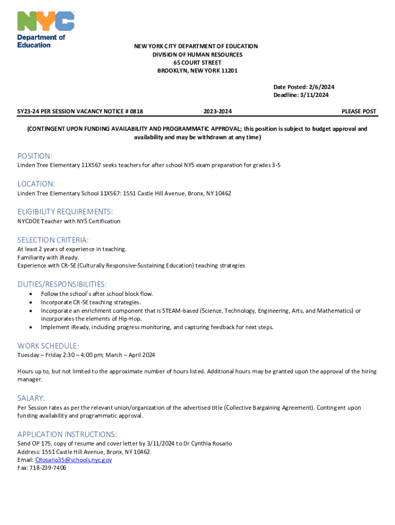 NEW YORK CITY DEPARTMENT OF EDUCATION DIVISION OF HUMAN RESOURCES 65 COURT STREET BROOKLYN, NEW YORK 11201 Date Posted: 2/6/2024 Deadline: 3/11/2024 SY2324 PER SESSION VACANCY NOTICE # 081820232024PLEASE