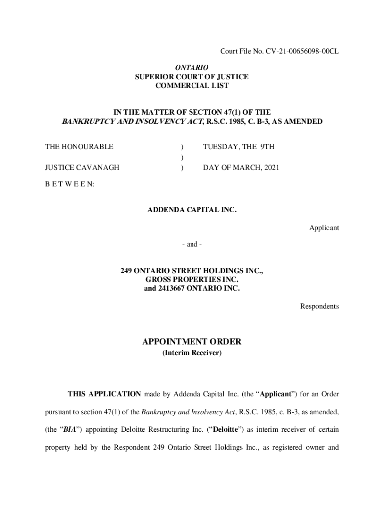 IN THE MATTER OF SECTION 47(1) OF BANKRUPTCY AND INSOLVENCY ACT, R.S.C. 1985, C. B3, AS AMENDED