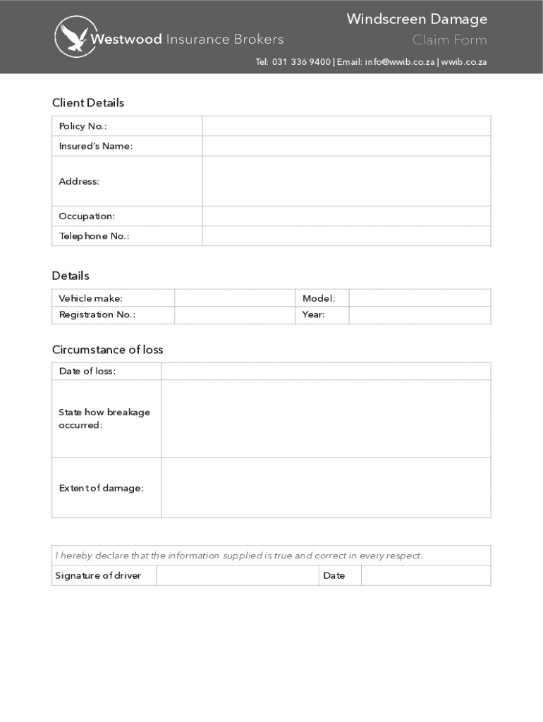 Windscreen Damage Claim Form Tel: 031 336 9400 | Email: info@wwib.co.za | wwib.co.zaClient Details Policy No.: Insureds Name: Address: Occupation: Telephone No.:Details Vehicle make:Model:Registration
