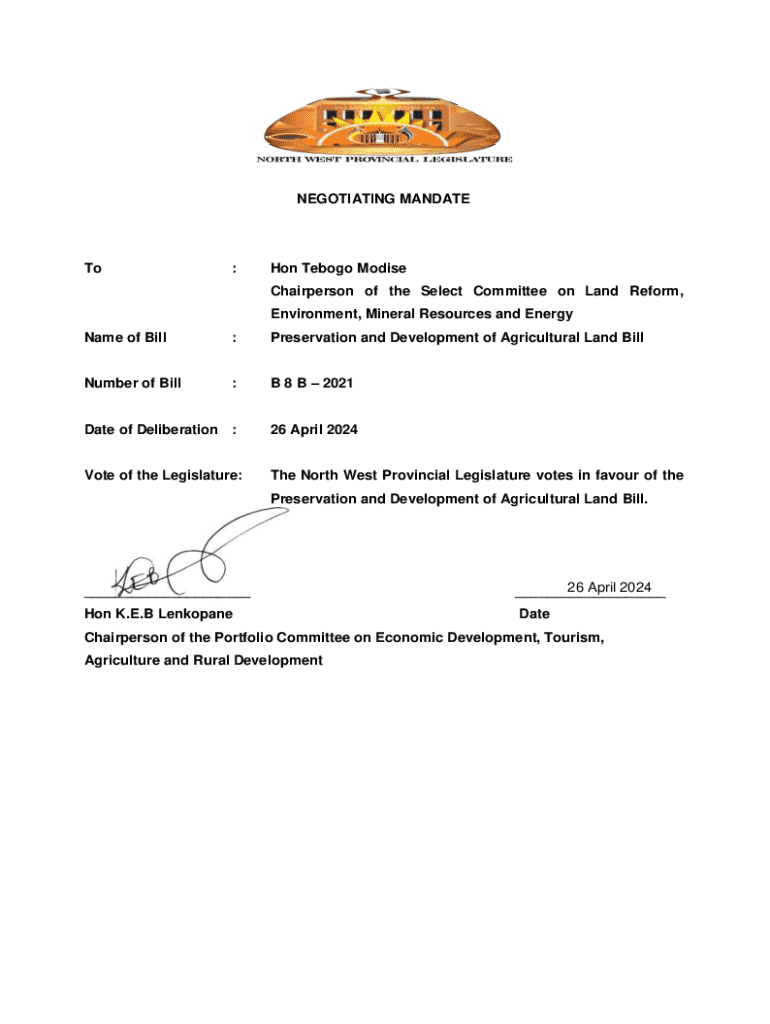 This document details the negotiating mandate for the Preservation and Development of Agricultural Land Bill B 8 B — 2021, approved by the North West Provincial Legislature on 26 April 2024.