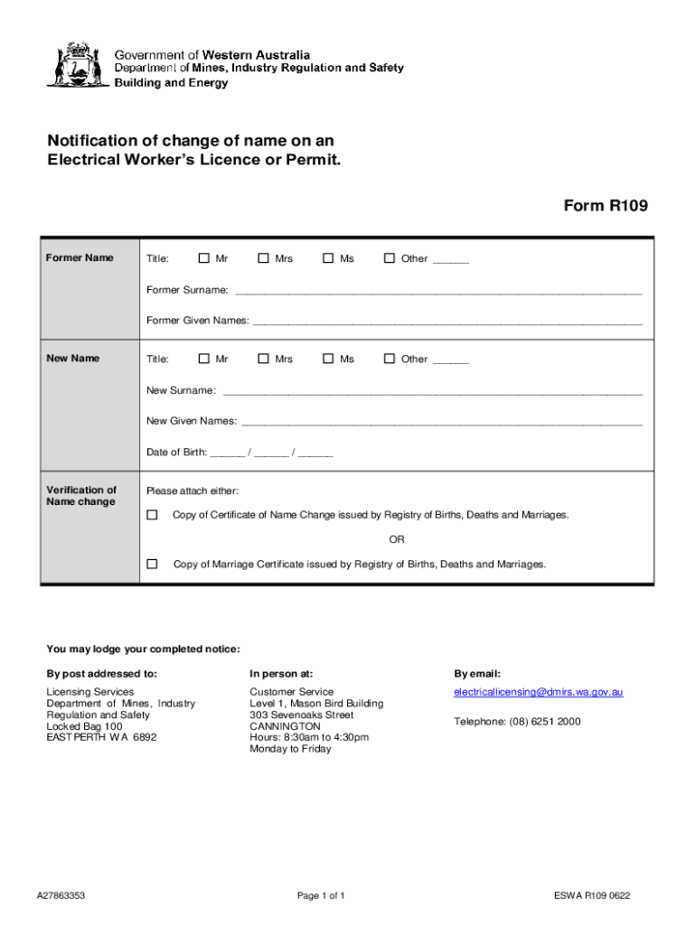 Complete this form to notify the Department of Mines, Industry Regulation and Safety about a name change on your Electrical Worker’s License or Permit. Include necessary documents.