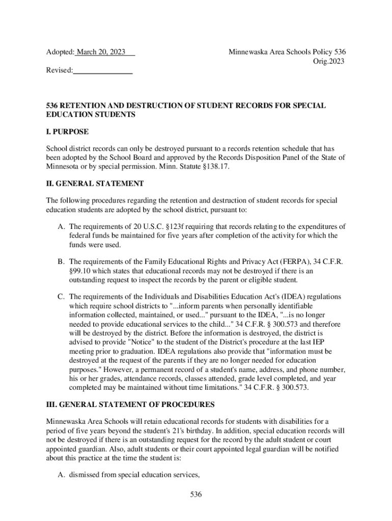 Adopted: March 20, 2023Minnewaska Area Schools Policy 536 Orig.2023Revised:536 RETENTION AND DESTRUCTION OF STUDENT RECORDS FOR SPECIAL EDUCATION STUDENTS I. PURPOSE School district records can only