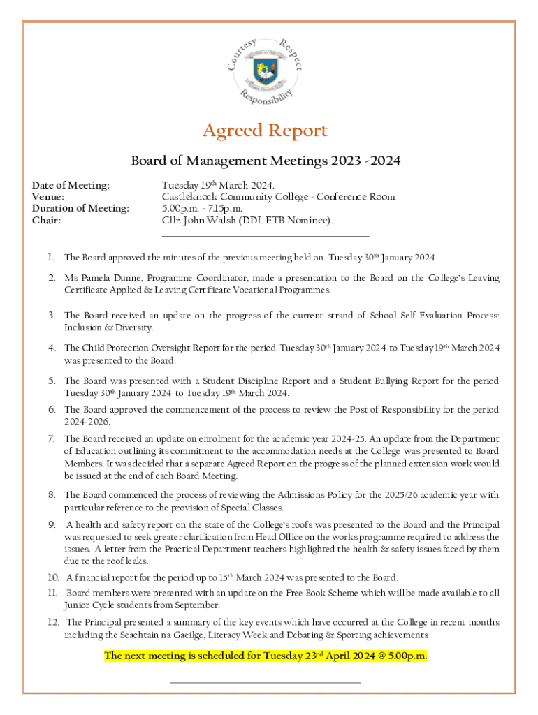 This report outlines the discussions and decisions from the Board of Management meeting on March 19, 2024, covering key topics like enrollment, student discipline, and health safety.
