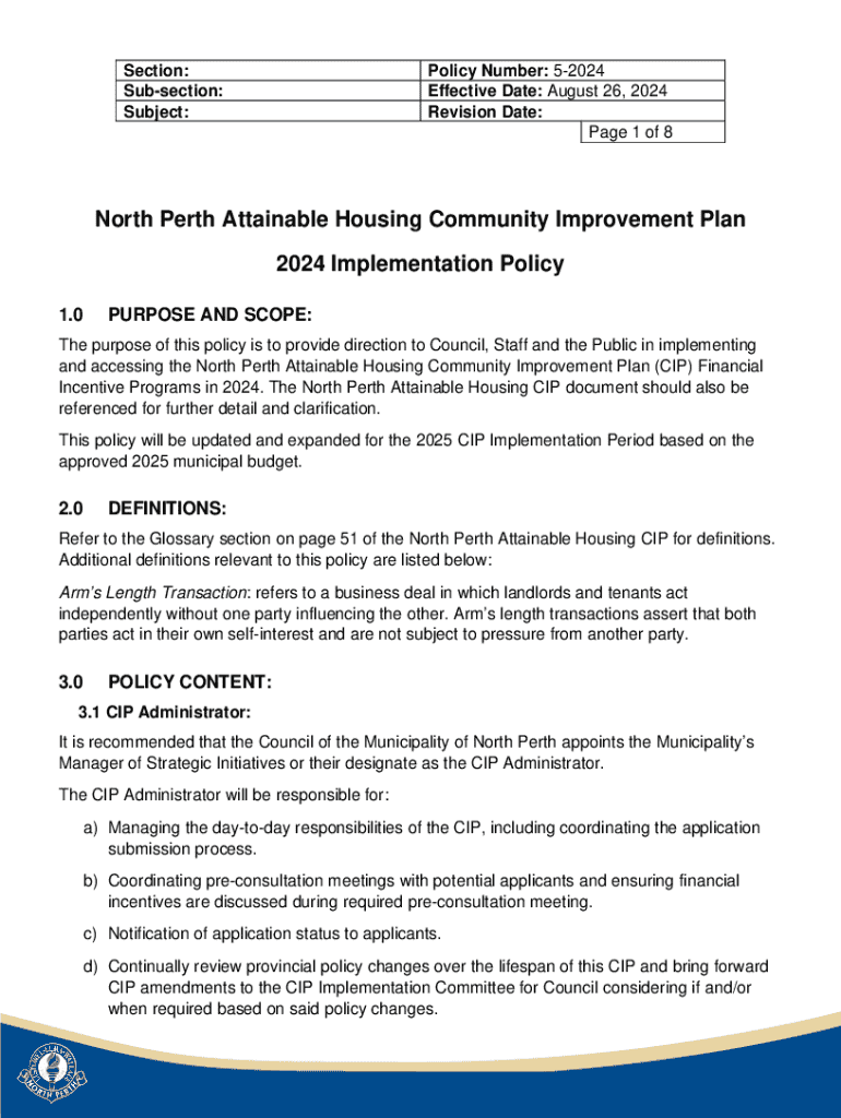 This policy directs the implementation of the North Perth Attainable Housing CIP Financial Incentive Programs for 2024, promoting affordable housing initiatives.