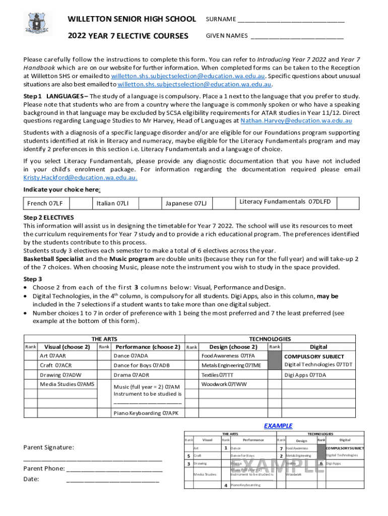WILLETTON SENIOR HIGH SCHOOLSURNAME ___2022 YEAR 7 ELECTIVE COURSESGIVEN NAMES ___Please carefully follow the instructions to complete this form. You can refer to Introducing Year 7 2022 and Year