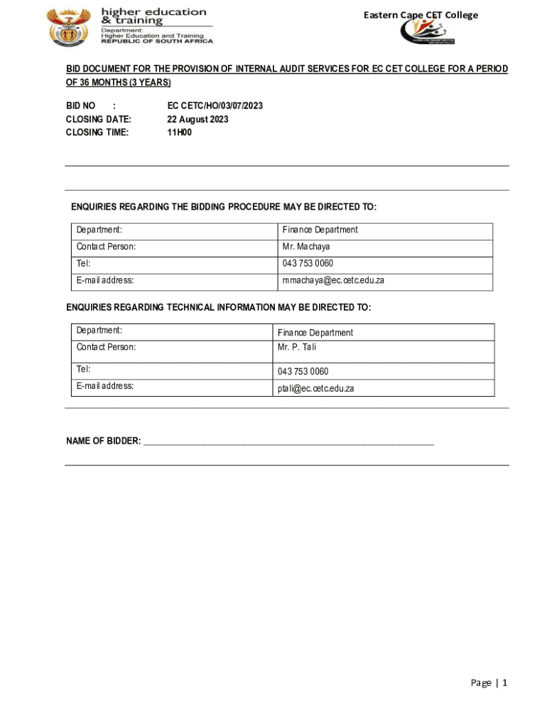 Eastern Cape CET CollegeBID DOCUMENT FOR THE PROVISION OF INTERNAL AUDIT SERVICES FOR EC CET COLLEGE FOR A PERIOD OF 36 MONTHS (3 YEARS) BID NO : CLOSING DATE: CLOSING TIME:EC CETC/HO/03/07/2023 22
