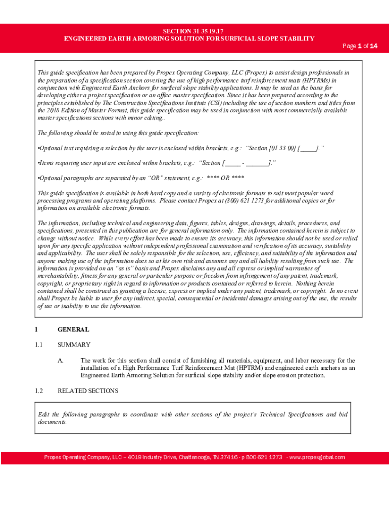 This specification guide outlines the use of Harms and engineered earth anchors for slope stability and erosion control, providing essential installation details and safety guidelines.