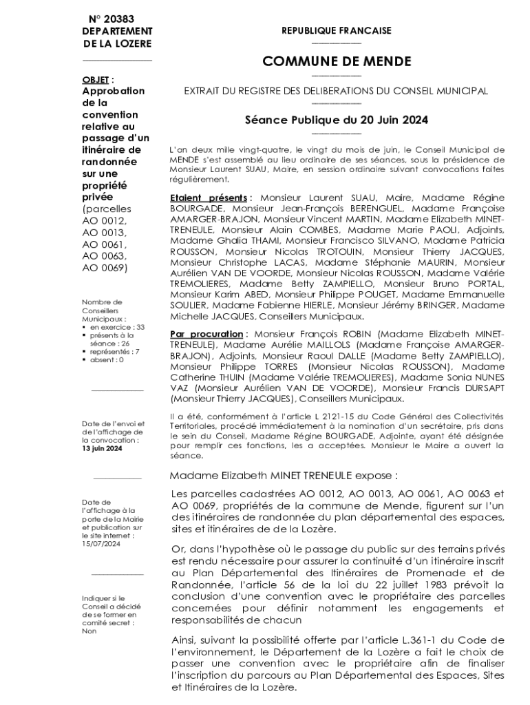 N 20383 DEPARTEMENT DE LA LOZERE ___ OBJET :Approbation de la convention relative au passage dun itinraire de randonne sur une proprit prive (parcelles AO 0012, AO 0013, AO 0061, AO 0063, AO 0069)Nombre