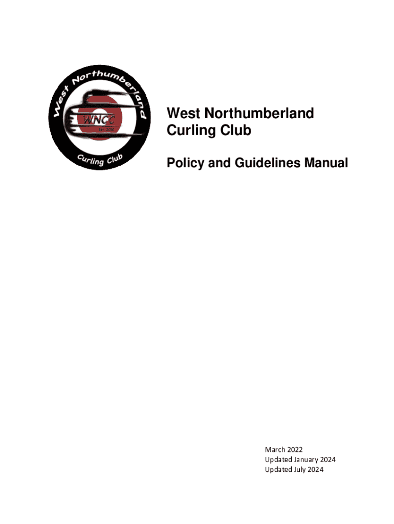 West Northumberland Curling Club Policy and Guidelines ManualMarch 2022 Updated January 2024 Updated July 2024Table of Contents WEST NORTHUMBERLANDS CURLING CLUB POLICIESINTRODUCTION1. Governance