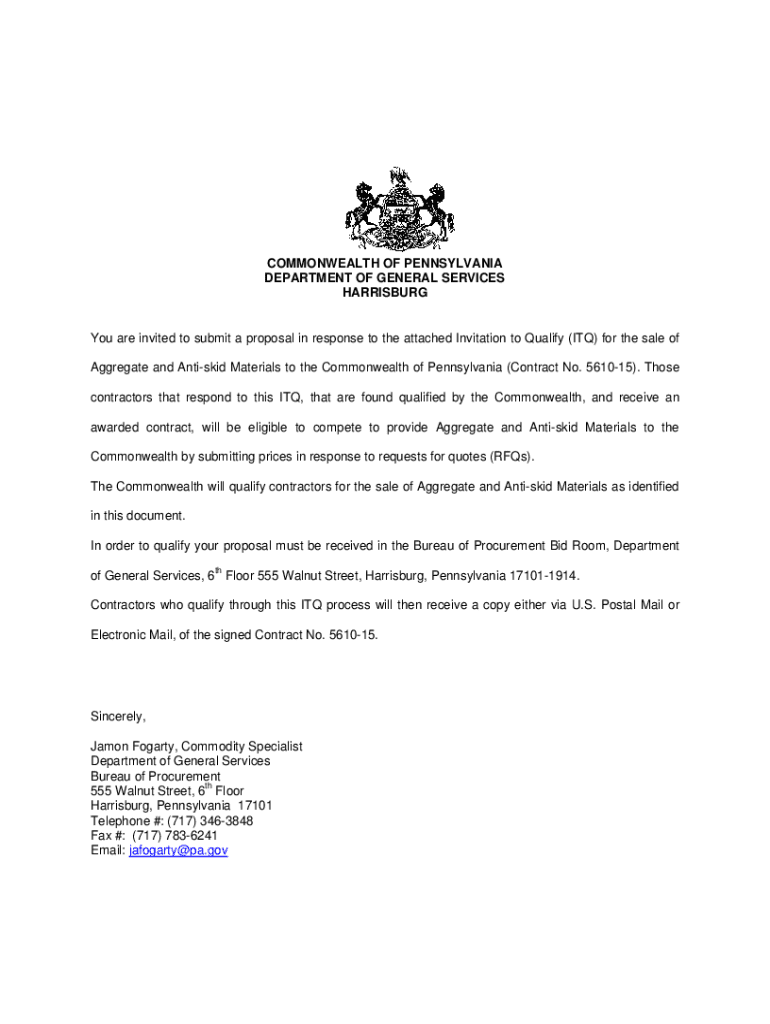 COMMONWEALTH OF PENNSYLVANIA DEPARTMENT OF GENERAL SERVICES HARRISBURGYou are invited to submit a proposal in response to the attached Invitation to Qualify (ITQ) for the sale of Aggregate and Antiskid