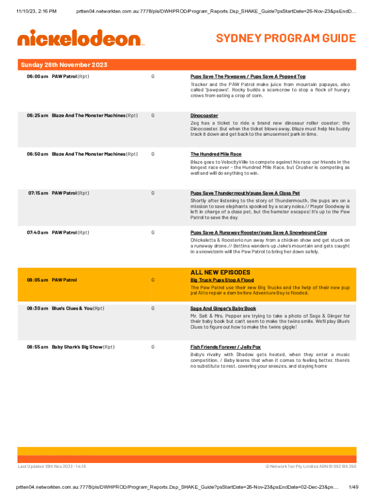 11/10/23, 2:16 PMprtten04.networkten.com.AU:7778/pls/PROD/Program_Reports.Dsp_SHAKE_Guide?psStartDate26Nov23&psEndDSYDNEY PROGRAM GUIDE Sunday 26th November 2023 06:00 am PAW Patrol (RPT)Pups Save