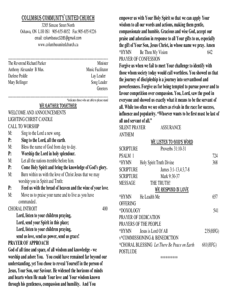 Columbus Community United Church 3285 Since Street North Oshawa, ON L1H 0S1 9056558852 Fax:9056559226 email: columbusuc3285@gmail.com www.columbusunitedchurch.ca ___ The Reverend Richard Parker Minister