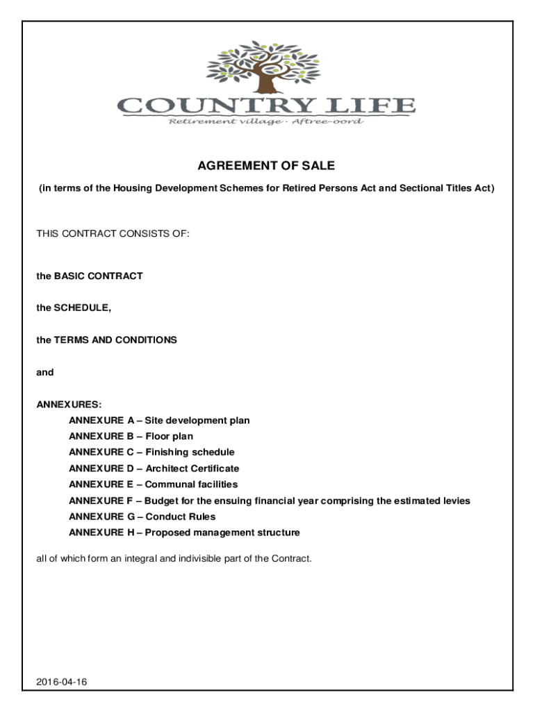 This document is a comprehensive agreement of sale for units in the Country Life Retirement Village, detailing terms, conditions, and compliance with relevant legislation for retirees.
