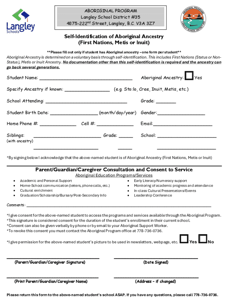 This form allows students in Langley School District to self-identify their Aboriginal ancestry, granting access to educational programs and support.