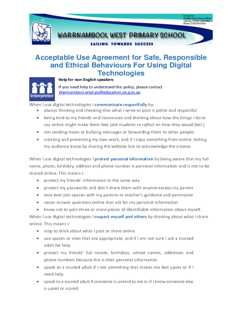 Acceptable Use Agreement for Safe, Responsible and Ethical Behaviors For Using Digital Technologies Help for non-English speakers If you need help to understand this policy, please contact Warrnambool.west.ps@education.vic.gov.auWhen