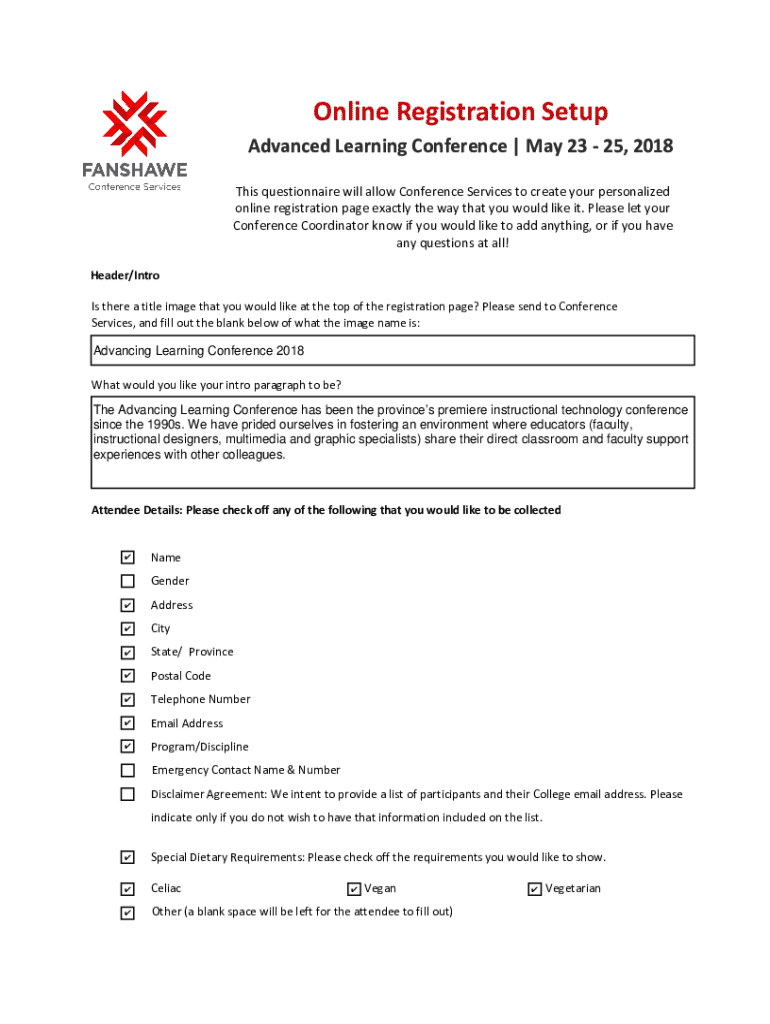 Online Registration Setup Advanced Learning Conference | May 23 25, 2018 This questionnaire will allow Conference Services to create your personalized online registration page exactly the way that
