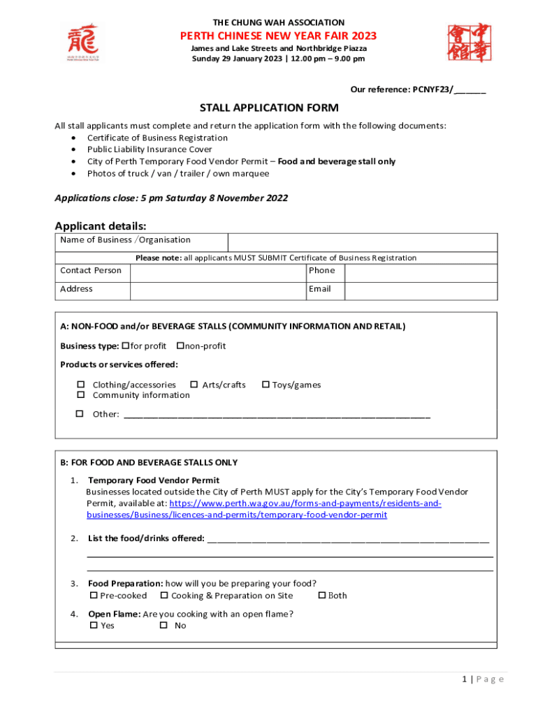 Apply for a stall at the Perth Chinese New Year Fair 2023. Submit your application by November 8, 2022, with required documents to participate.