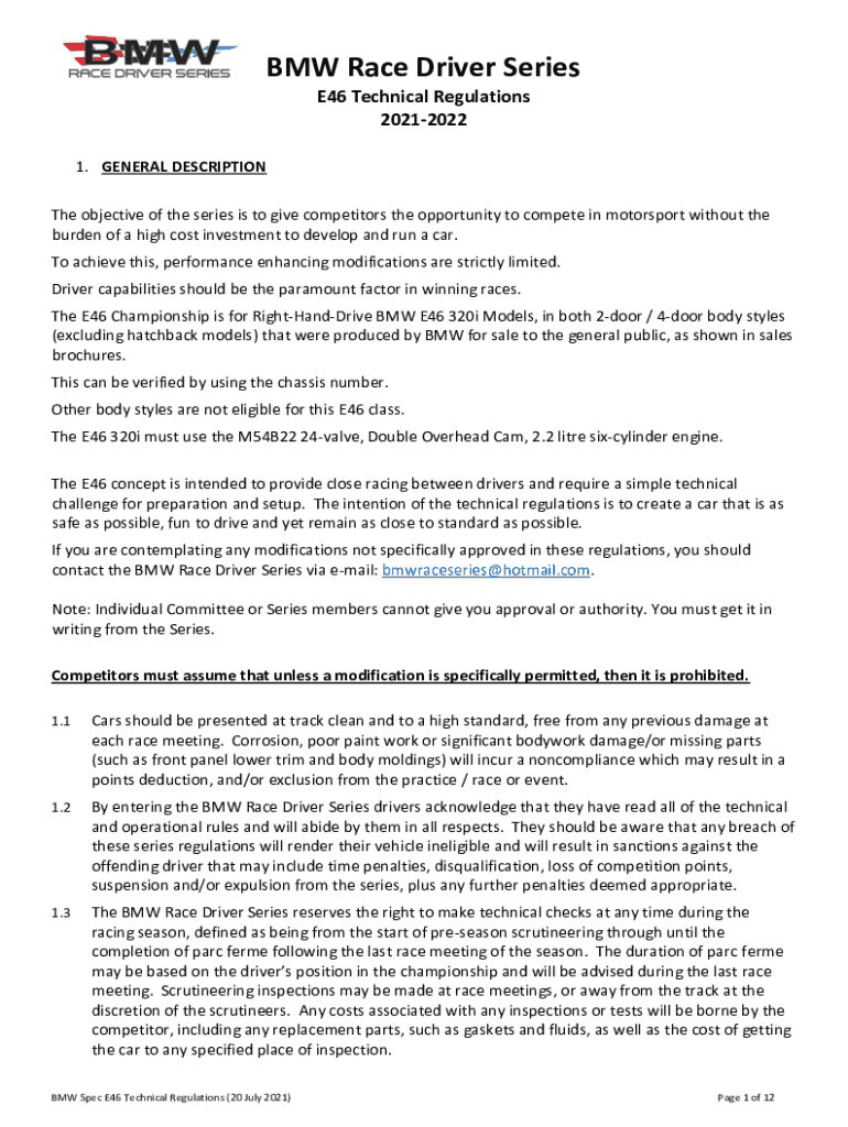BMW Race Driver Series E46 Technical Regulations 20212022 1. GENERAL DESCRIPTION The objective of the series is to give competitors the opportunity to compete in motorsport without the burden of a