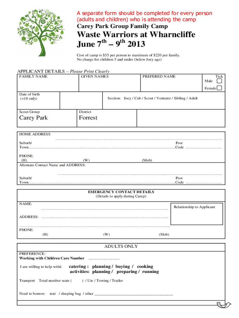 Register for the Carey Park Family Camp happening June 7-9, 2013. Ensure all attendees are accounted for by filling in each person\'s details. Cost is $55 per person.