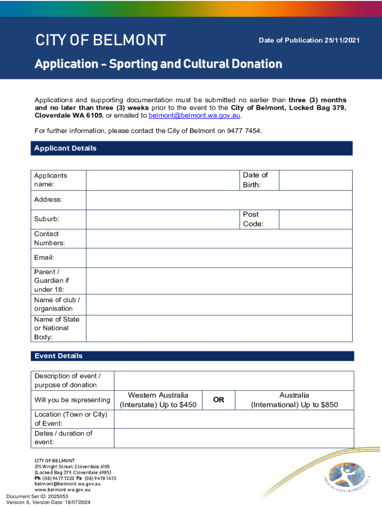 CITY OF Belmonte of Publication 25/11/2021Application Sporting and Cultural Donation Applications and supporting documentation must be submitted no earlier than three (3) months and no later than