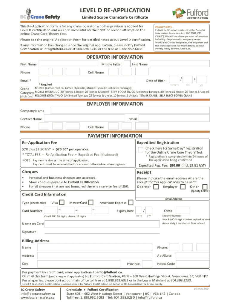 LEVEL D REAPPLICATION Limited Scope CraneSafe Certificate This ReApplication form is for any crane operator who has previously applied for Level D certification and was not successful on their first