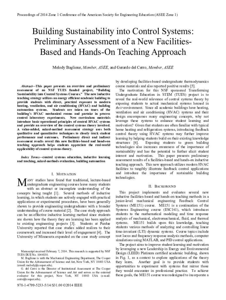 Proceedings of 2014 Zone 1 Conference of the American Society for Engineering Education (SEE Zone 1)Building Sustainability into Control Systems: Preliminary Assessment of a New FacilitiesBased and