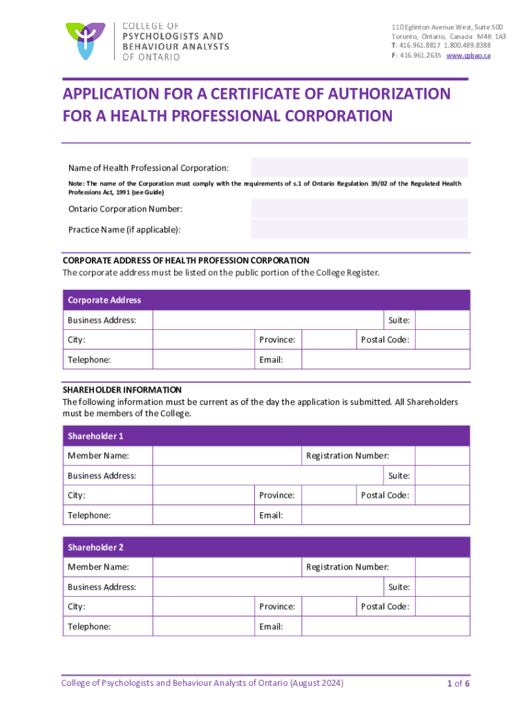 110 Eglinton Avenue West, Suite 500 Toronto, Ontario, Canada M4R 1A3 T: 416.961.8817 1.800.489.8388 F: 416.961.2635 www.cpbao.caAPPLICATION FOR A CERTIFICATE OF AUTHORIZATION FOR A HEALTH PROFESSIONAL