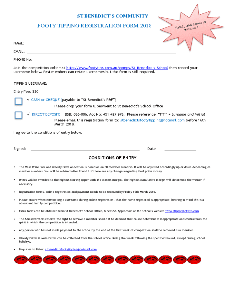 Individuals who wish to participate in a footy tipping competition are required to file the footy tipping registration form.