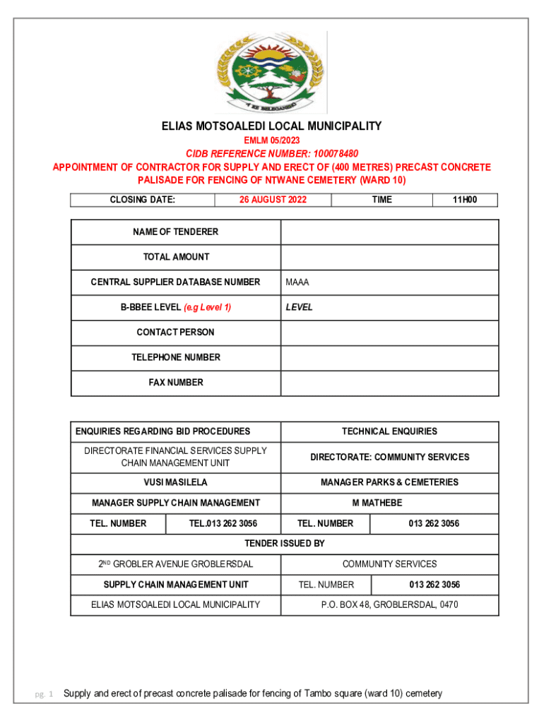 ELIAS MOTSOALEDI LOCAL MUNICIPALITY ELM 05/2023CIDB REFERENCE NUMBER: 100078480 APPOINTMENT OF CONTRACTOR FOR SUPPLY AND ERECT OF (400 Meters) PRECAST CONCRETE PALISADE FOR FENCING OF NTW ANE CEMETERY